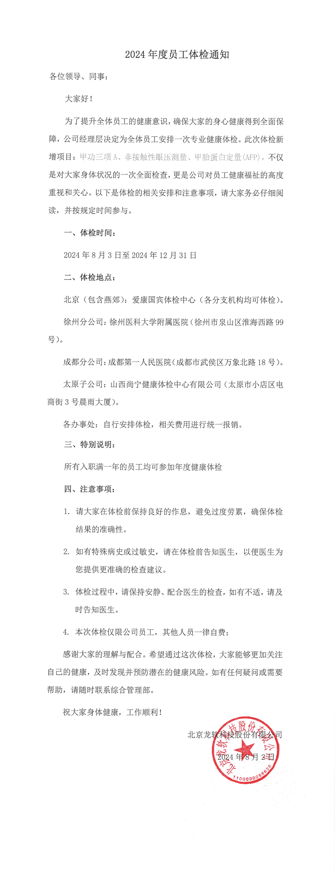 2024年度员工体检通知