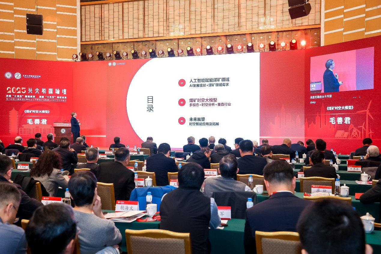 2025年10月28日,第六届北大能源论坛暨北京大学能源研究院成立五周年学术交流会在北京大学隆重举行。在党的二十届四中全会精神指引下,本届论坛以“回顾‘十四五’能源成就,展望‘十五五’美好未来”为主题,进行了广泛而深入的学术交流。北京大学党委书记何光彩出席了论坛活动,中国科学院、中国工程院共27位院士及一位国外院士出席了论坛。国际能源署署长法提赫·比罗尔(Fatih Birol)、北京大学副校长朴世龙院士、中国能源研究会理事长史玉波、中国石油学会理事长焦方正、鄂尔多斯市副市长张秀玲分别致辞。中国科学院院士、北京大学能源研究院院长、北京大学鄂尔多斯能源研究院院长金之钧作研究院五周年工作汇报。北京大学教授、北京大学能源研究院智慧能源方向负责人、北京大学鄂尔多斯能源研究院智慧矿山方向首席科学家、我公司董事长毛善君参加论坛并作《煤矿时空大模型》主旨报告。