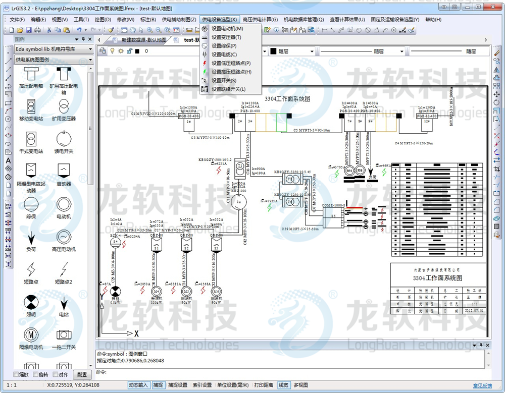 供电设计图形协同管理系统包括机电图形协同管理、供电设备选型计算和固定设备选型计算等模块。机电图形协同管理是基于一张图管理模式,以在线协同的方式设计运输系统图、设备布置图、供排水系统图、通讯联络系统图、人员定位系统图、供电系统图等机电图形。供电设备选型计算是基于标准的供电设备图例库绘制供电系统图,对电动机、变压器、电缆、各类开关进行相应的供电计算与校验,从设备参数数据库选出合适的供电设备,并自动生成供电设计报告。固定设备选型计算是对辅助运输巷绞车、运输机、排水等设备进行选型计算,选出合适的设备,生成相应的设备选型设计报告。