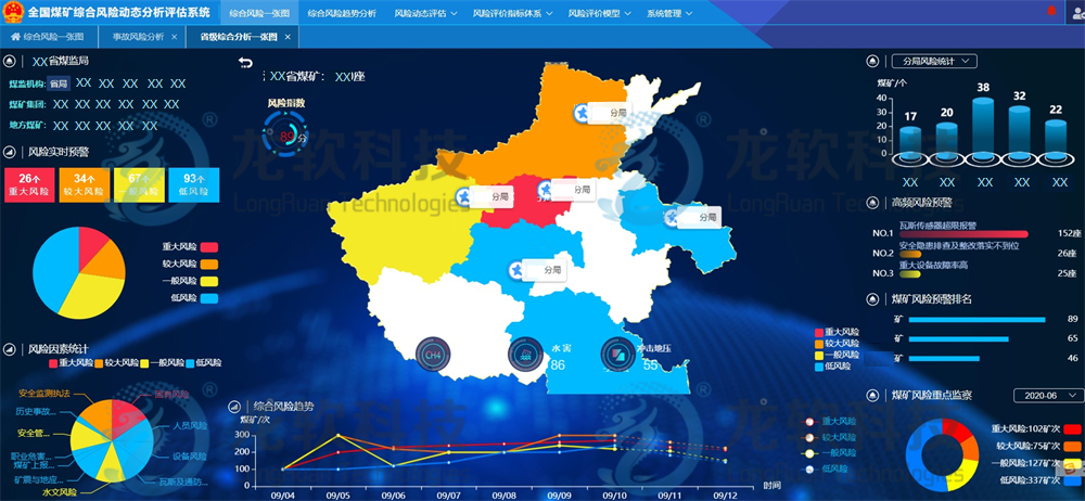 通过对矿井基础数据、安全管理数据、监察执法数据、事故数据、地理信息数据的动态集成,根据矿山行业的相关规程规范、监管监察条例等建立综合风险评价指标体系和评价模型,运用互联网+、大数据分析、云计算、人工智能等技术,智能分析出区域矿山风险级别、区域风险态势、风险趋势变化等,为新时代矿山精准执法、远程监察、事故追溯提供信息化支撑。