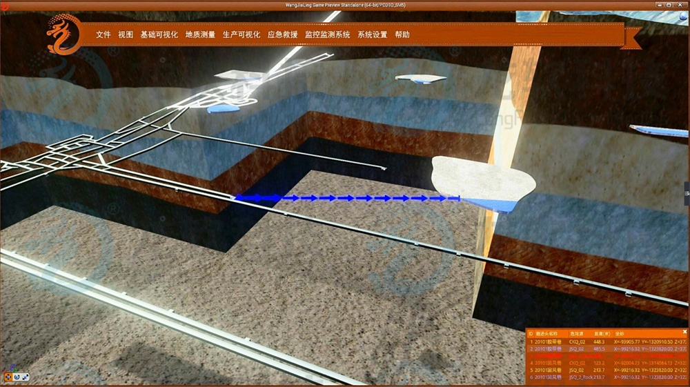 ( 6)地质大数据分析与隐蔽致灾预警报警分析和预警平台。基于taptap点点官网云平台,对煤矿地层、构造、煤层、煤质、瓦斯、水文和其它地质条件、地质特征及其变化规律进行可视化智能分析,实现隐蔽致灾因素(水害、瓦斯、冲击地压等)的预测预报,基于巷道、地层和生产的时空关系,进行危险源的远程可视化智能预警。
